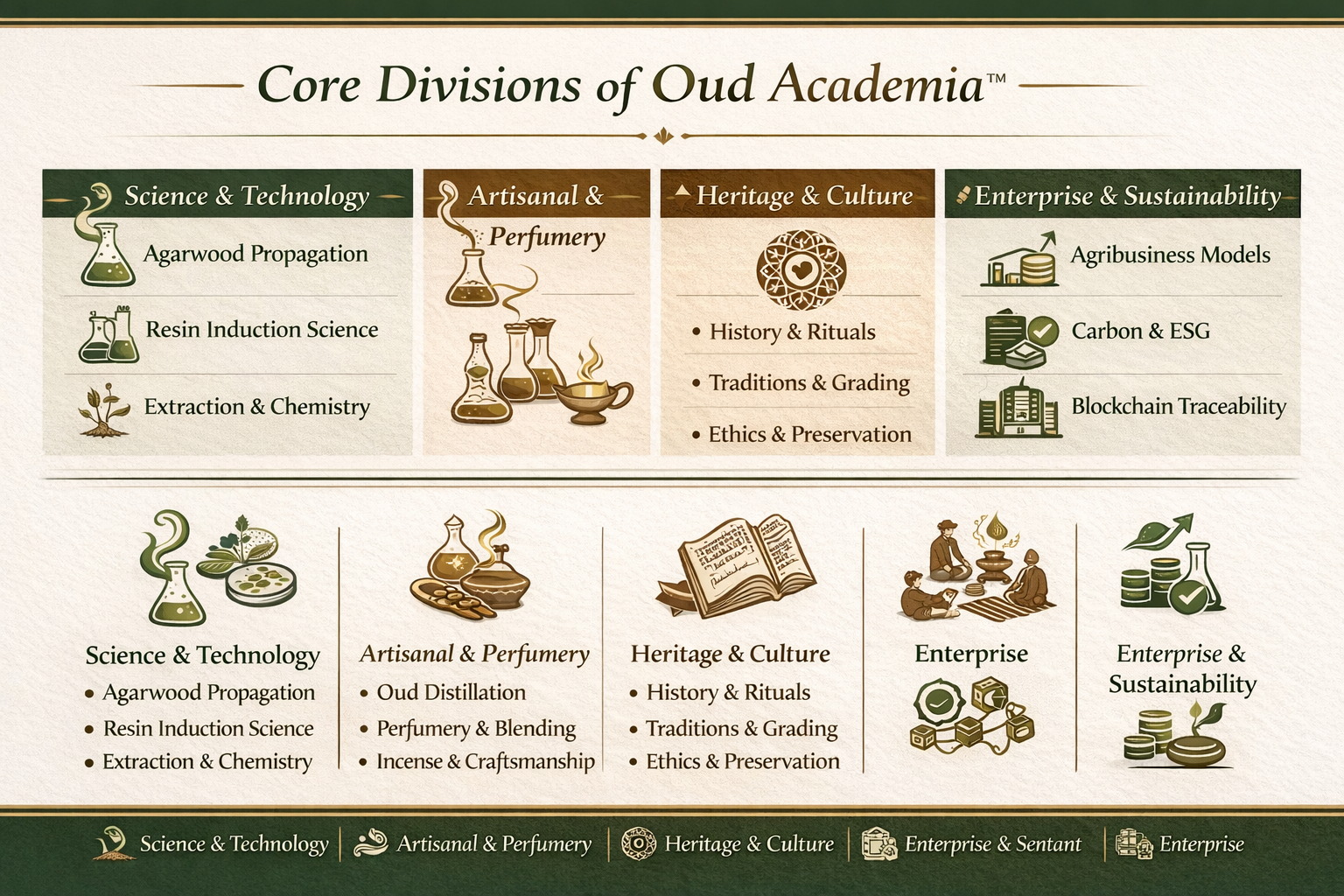 Oud Academia™ is more than an academy. It is a bridge between ancient craftsmanship and modern biotechnology. A sanctuary where foresters, farmers, perfumers, distillers, and researchers unite under one mission: