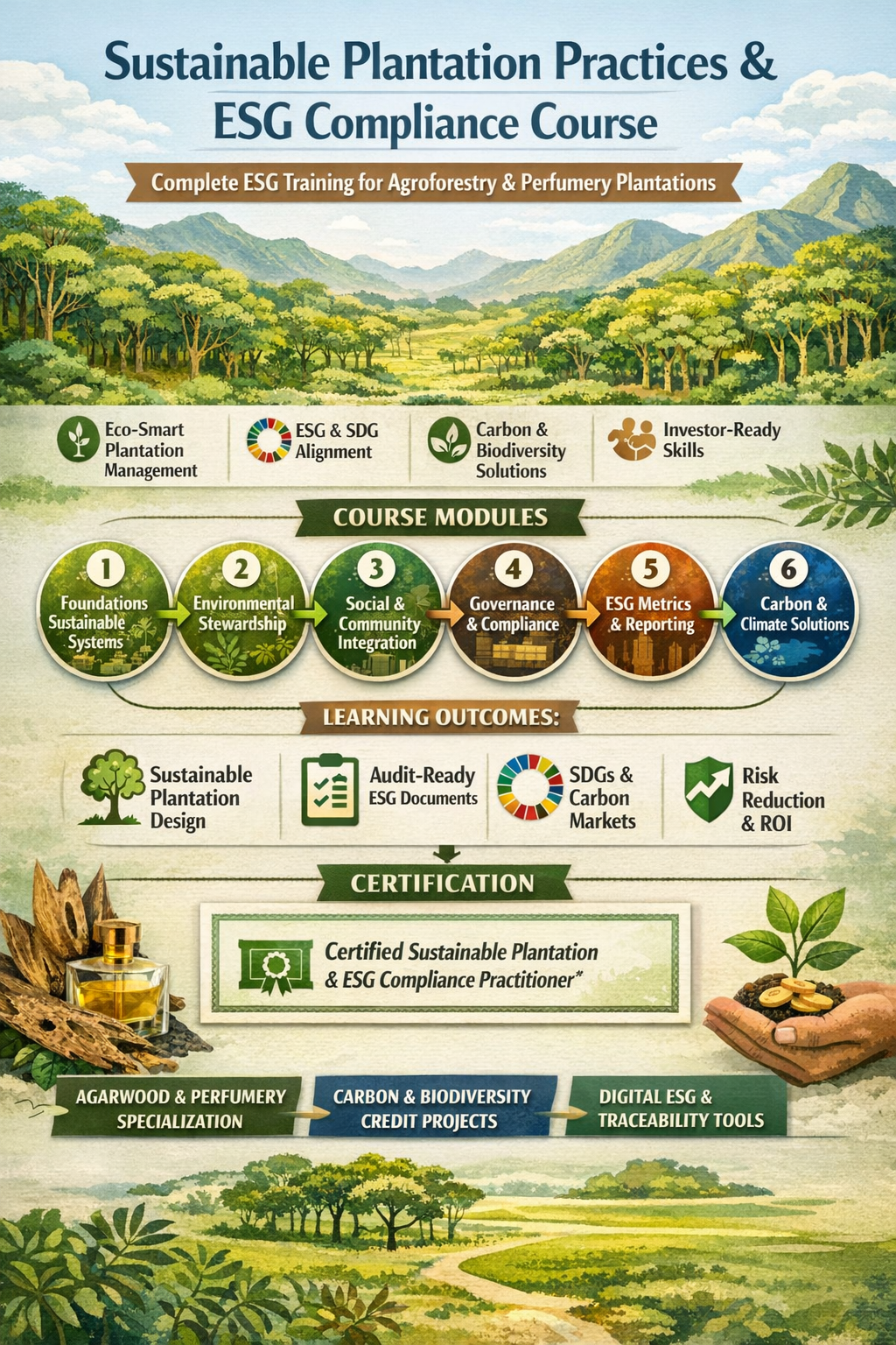 Designed for agarwood and perfumery crop plantations, yet adaptable across tropical agroforestry systems, the course reframes sustainability from a compliance burden into a long-term value driver—reducing risk, unlocking premium markets, and strengthening resilience against climate and regulatory shocks.