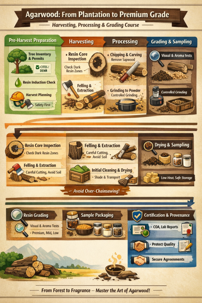 It bridges practical field techniques, scientific evaluation methods, and trade standards to ensure high-value, legally compliant agarwood products.