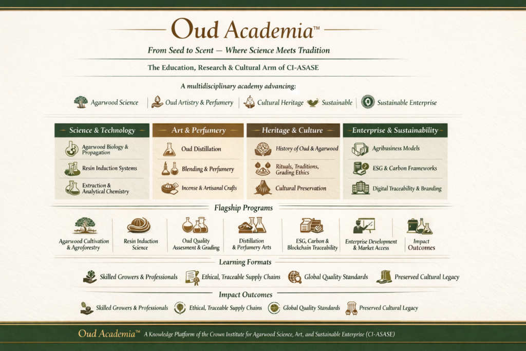 Positioned as the education, research, and cultural pillar of the Crown Institute for Agarwood Science, Art, and Sustainable Enterprise (CI-ASASE), Oud Academia™ is not merely an academic institution—it is a strategic asset designed to professionalize, protect, and elevate the global oud value chain.